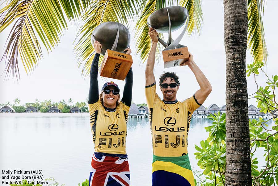 Molly Picklum (AUS) and Yago Dora (BRA) claimed victory at the Lexus WSL Finals Fiji Presented by Corona Cero, the Final stop on the World Surf League (WSL) 2025 Championship Tour (CT), to be crowned the 2025 World Champions. Both Picklum and Dora entered the title deciding event as the No. 1 seeds and were able to put on stunning performances (…)